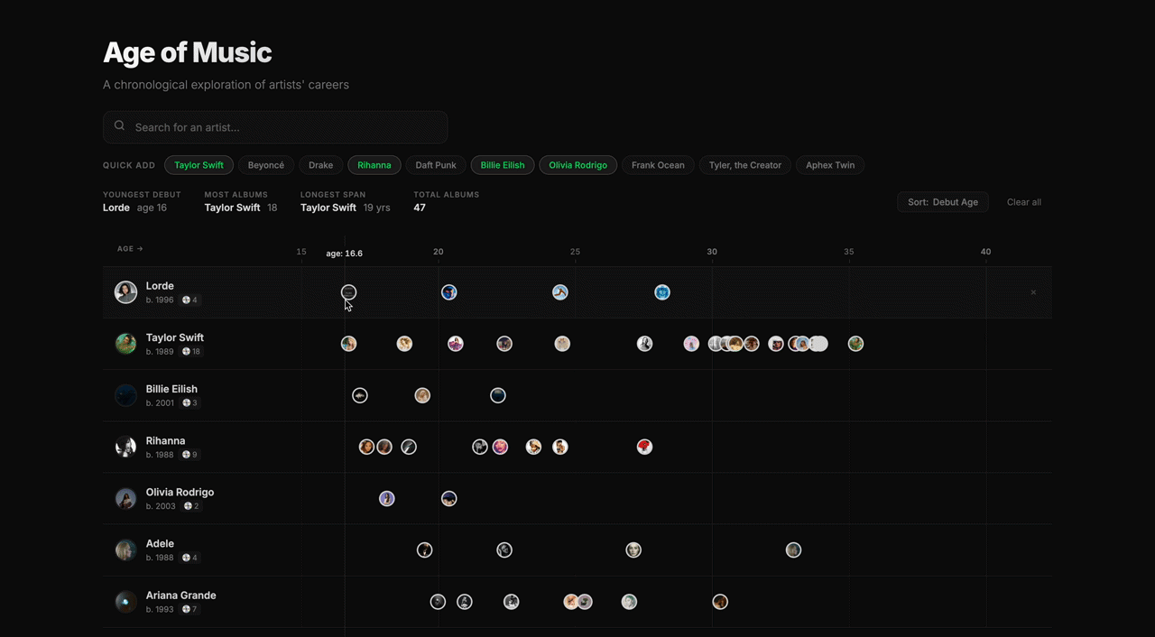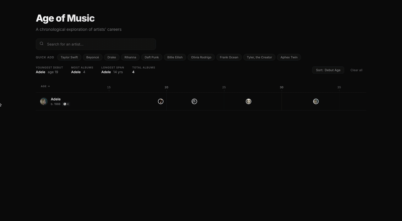 After observing countless online discussions regarding music, I realized how most people rarely think about how an artist's age at the time they make an album can factor into the brilliance of the artist or the timelessness of the album. To solve this, I created a web application which plots artists' discographies relative to their age, rather than year released. Give it a try here.