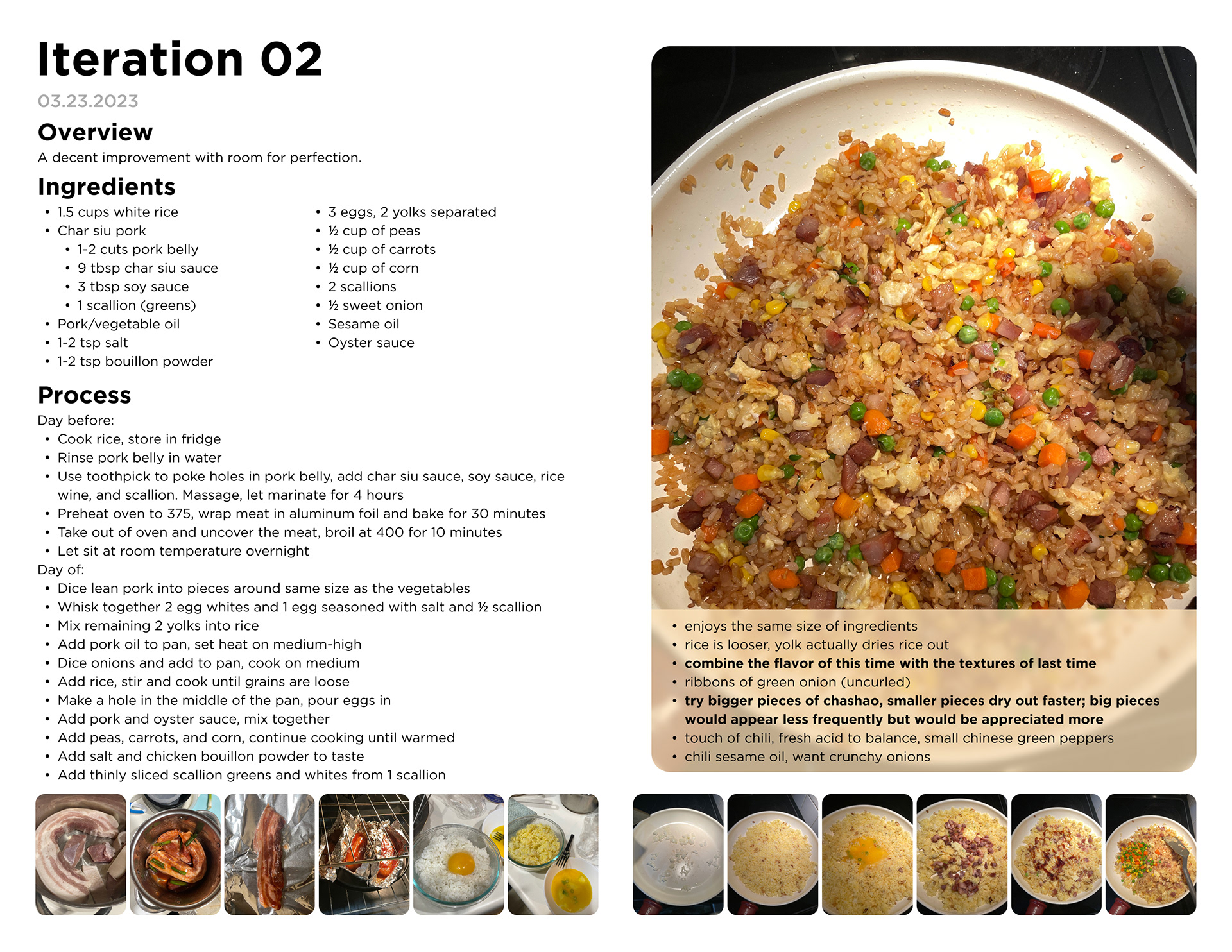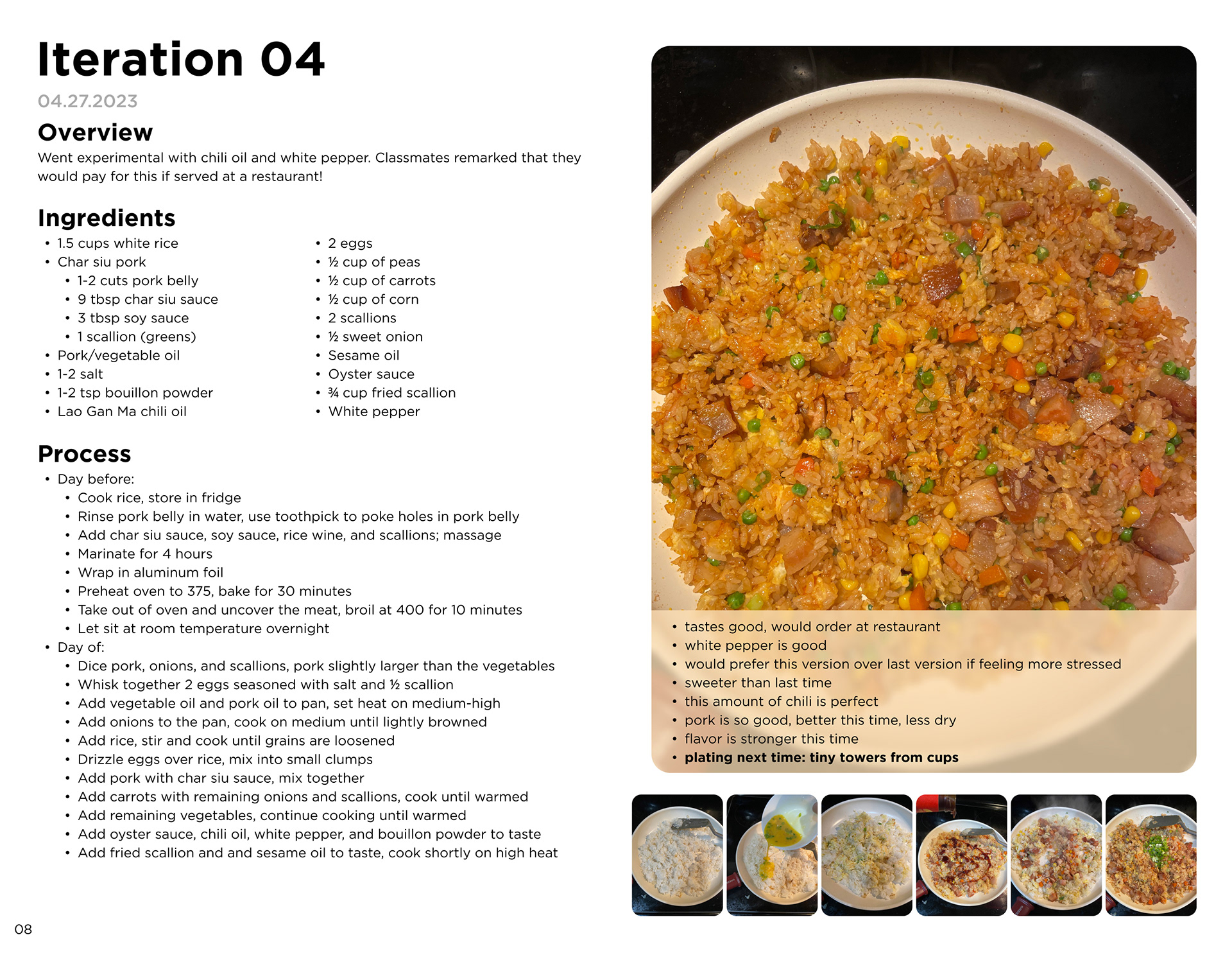 This is a semester-long project for RISD's Designing Food course. The project tasked me to choose a dish to cook and present to the class every two weeks with the intent of iteration. For my dish, I chose to iterate on fried rice.